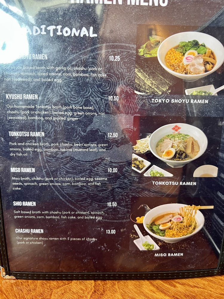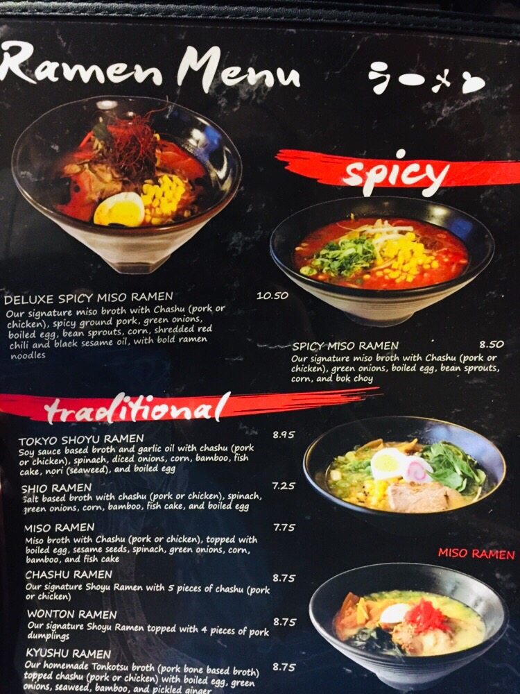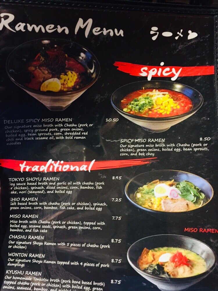 Spicy. Our signature miso broth with chashu (pork or chicken), green onions, boiled egg, bean sprouts, corn and bok choy.
